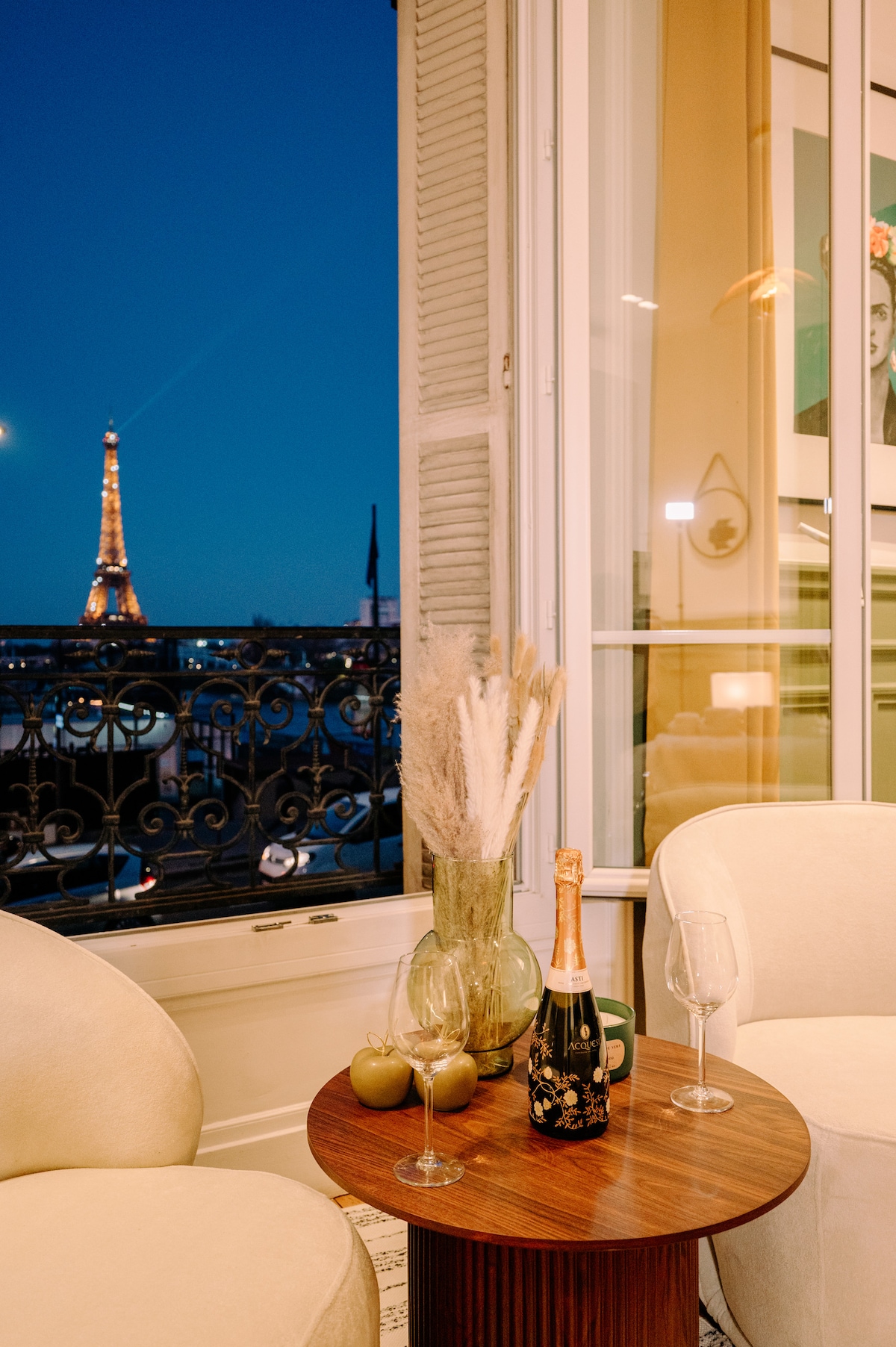 Experience the charm of Paris in this newly refurbished 1-bedroom apartment. Featuring a queen-size bed and ample closet space, this stylish retreat includes an Italian shower, a chic sofa, and a dining table. Enjoy breathtaking views of Paris from your private balcony. The fully equipped kitchen makes it easy to prepare meals at home. Located just steps from the Eiffel Tower and other iconic attractions, this apartment offers both comfort and style for an unforgettable stay in the City of Light