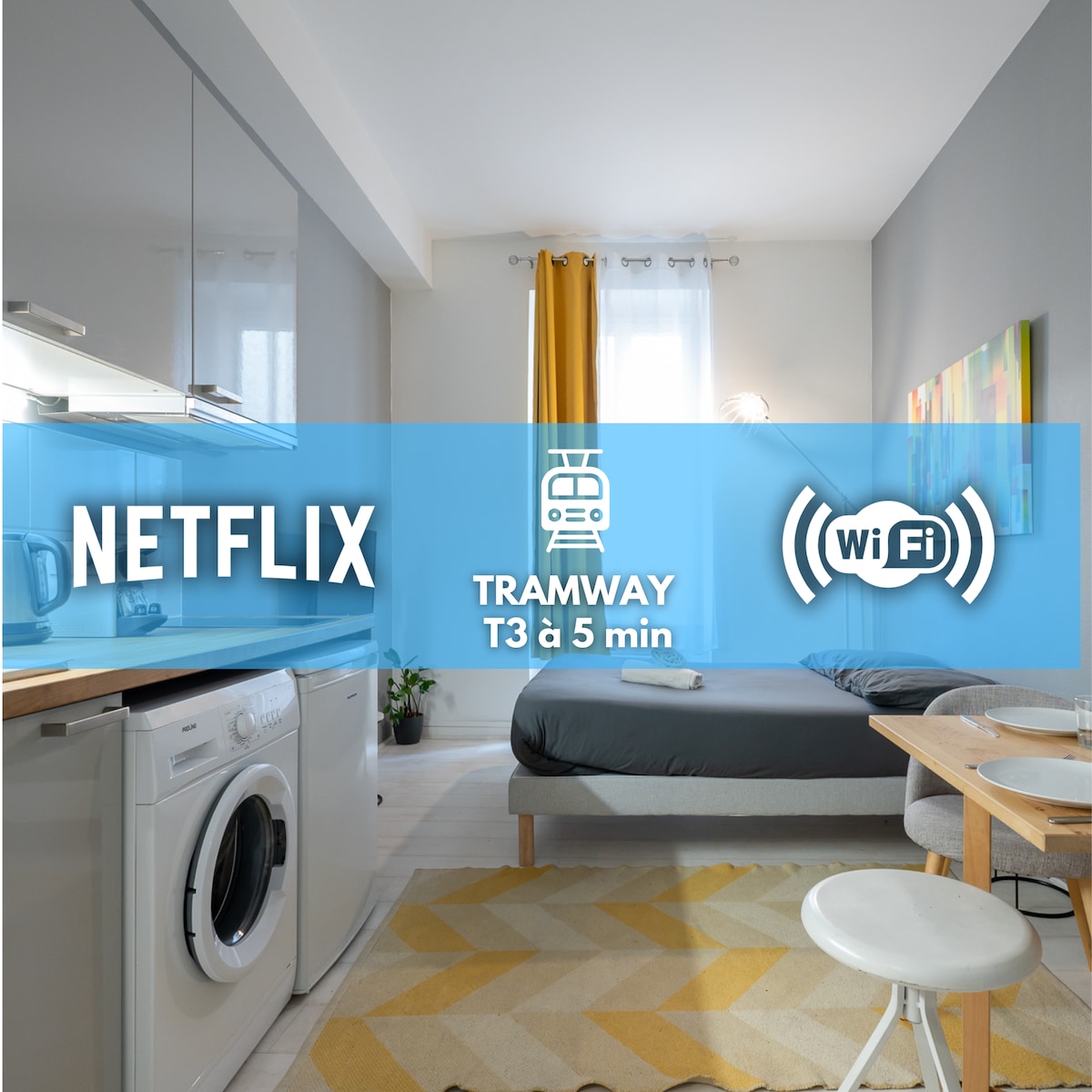 18m2のワンルームマンション、11m2のメザニン(高さ1m30)、設備の整ったキッチン(コンロ+電子レンジグリル)、洗濯機。 専用バスルームとトイレ。 2021年末に改装されました。 WiFiファイバーHD。 バスタオルをご用意しております。 パル・デュー駅から徒歩10分の場所にあります。 建物のすぐ下にバス停があり、路面電車T3線まで徒歩3分です。 到着:15時以降 チェックアウト:11時まで レイトチェックイン可能