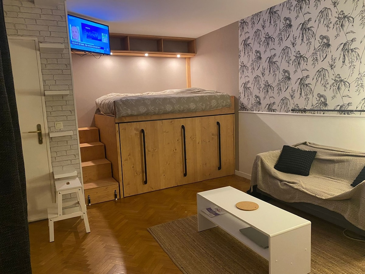 パリを観光するのに理想的なロケーションにある、テラスと16平方メートルの庭付きの25平方メートルの快適なワンルーム。 シャワー、トイレ、簡易キッチンを備えた静かなお部屋で、マルヌ川のほとりから30メートルの場所にあり、車や交通機関で簡単にアクセスできます。 屋根付き駐車場は無料でご利用いただけます(専用スペース)。