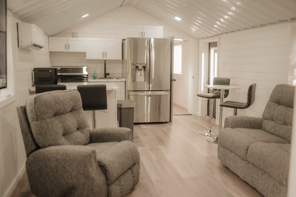 この1ベッドルームの小さな家でシンプルに過ごしましょう。寝室にはクイーンベッドが1台あります。ソファは少し短く、フルサイズのベッドにもなります。浴槽とシャワーの両方を備えたバスルームが1つあります。冷蔵庫、対流電子レンジ、2つのバーナー赤外線クックトップを備えた設備の整った簡易キッチンがあります。4人掛けのテーブルがあり、ウェルカムデスクは作業スペースとしてもご利用いただけます。ラッセル・スプリングスの中心部からわずか1分の場所にあり、町に来たときに立ち寄って眠るのに最適な場所です。