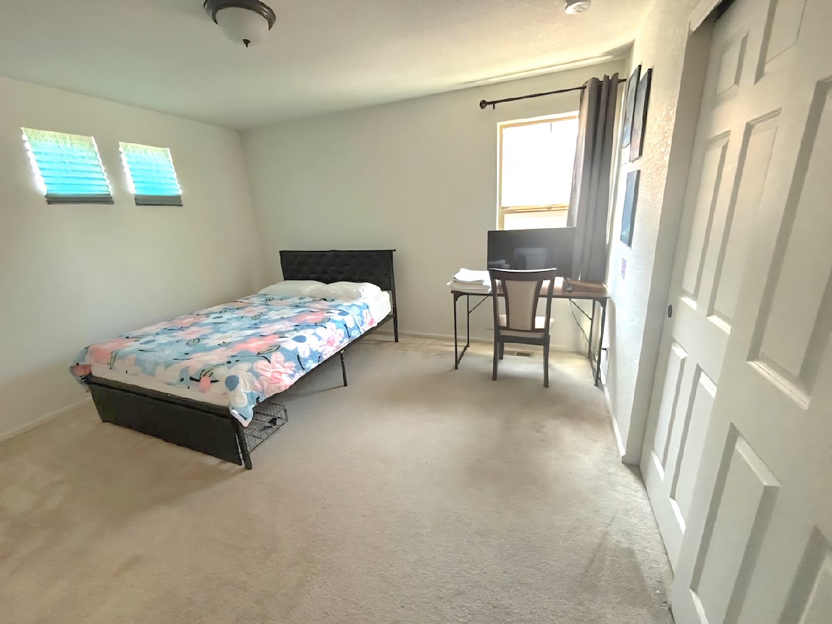 We have one bedroom with a queen bed, sidetable, a dresser, desk and chair and a closet. A mini fridge is also in the room for your convenience, stocked with water to keep you hydrated and a keurig is also in the room with a small coffee/tea station. Guests are welcome to use our laundry room, patio area, shared bathroom, and kitchen. There is a TV. Extra blankets are in the trunk at the end of the bed if needed. There is an ironing board/iron available. . Please feel free to ask any questions.