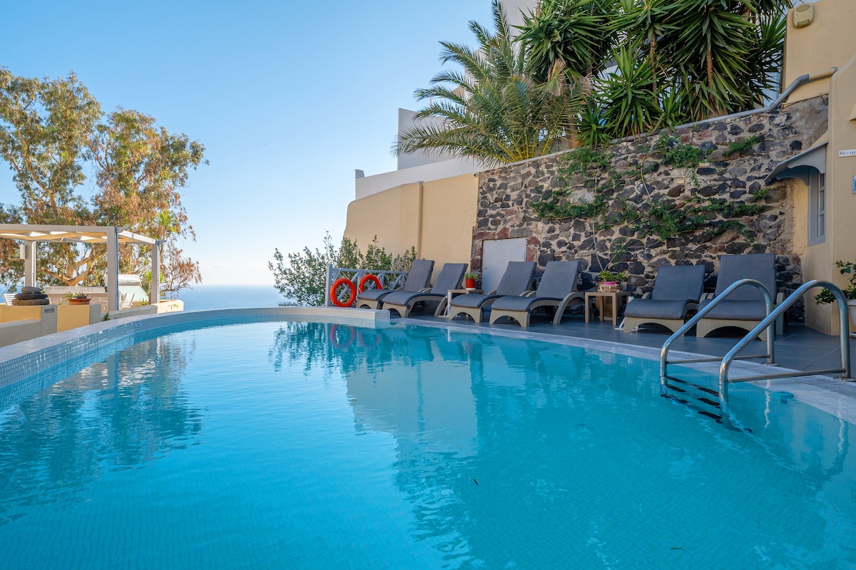 マジカルイメロヴィグリに位置し、スカロスに面した崖の上の伝統的な白い洗い流された環境に囲まれ、海抜400メートルの場所にあり、メガリカメニの火山島、世界的に有名なカルデラ、そしてもちろんエーゲ海の深い青い水のパノラマの景色を楽しめます。これから何年も覚えておくことになるでしょう... (ホテルはカルデラに位置しているため、お部屋や周辺へのアクセスには階段がある場合がありますのでご了承ください)
