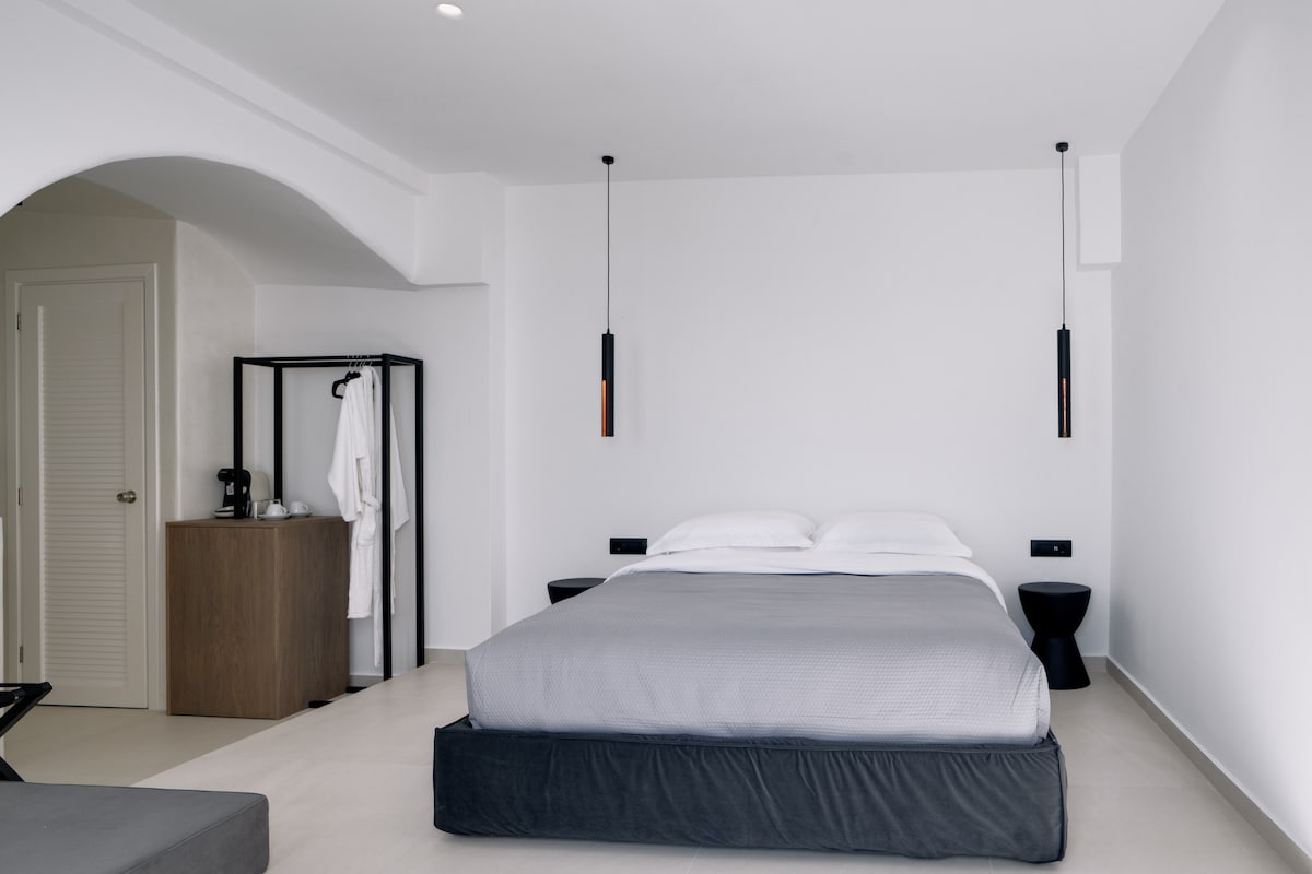 18平方メートルのジュニアスイートには、最大2名様まで宿泊可能です。クイーンサイズベッド、シーティングエリア、豪華なアメニティとバスローブを備えたレインシャワーバスルームが特徴です。カルデラと火山のパノラマビューが楽しめる広い共用テラスからは、平和と落ち着きを感じることができ、カップルにとって特別な体験となります。