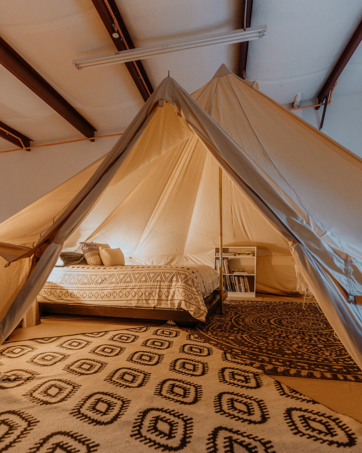 Meow WolfのHouse of Eternal Returnからわずか半ブロックの、楽しい屋内グランピングの楽園「Land of Encampment」へようこそ!美しく修復されたエアストリーム・サファリキャンピングカーに宿泊しましょう。快適なダブルベッドと、ロフトにはクイーンサイズベッドを備えた広々としたキャンバス製グランピングテントがあります。リビングには快適なデイベッドもあります。 お子様連れのご家族、クリエイティブな旅行者、カップル2組に最適なこの宿泊先は、ヴィンテージの魅力とモダンな快適さが融合し、サンタフェの最高のアート、グルメ、魔法からわずか数分の場所にあります。