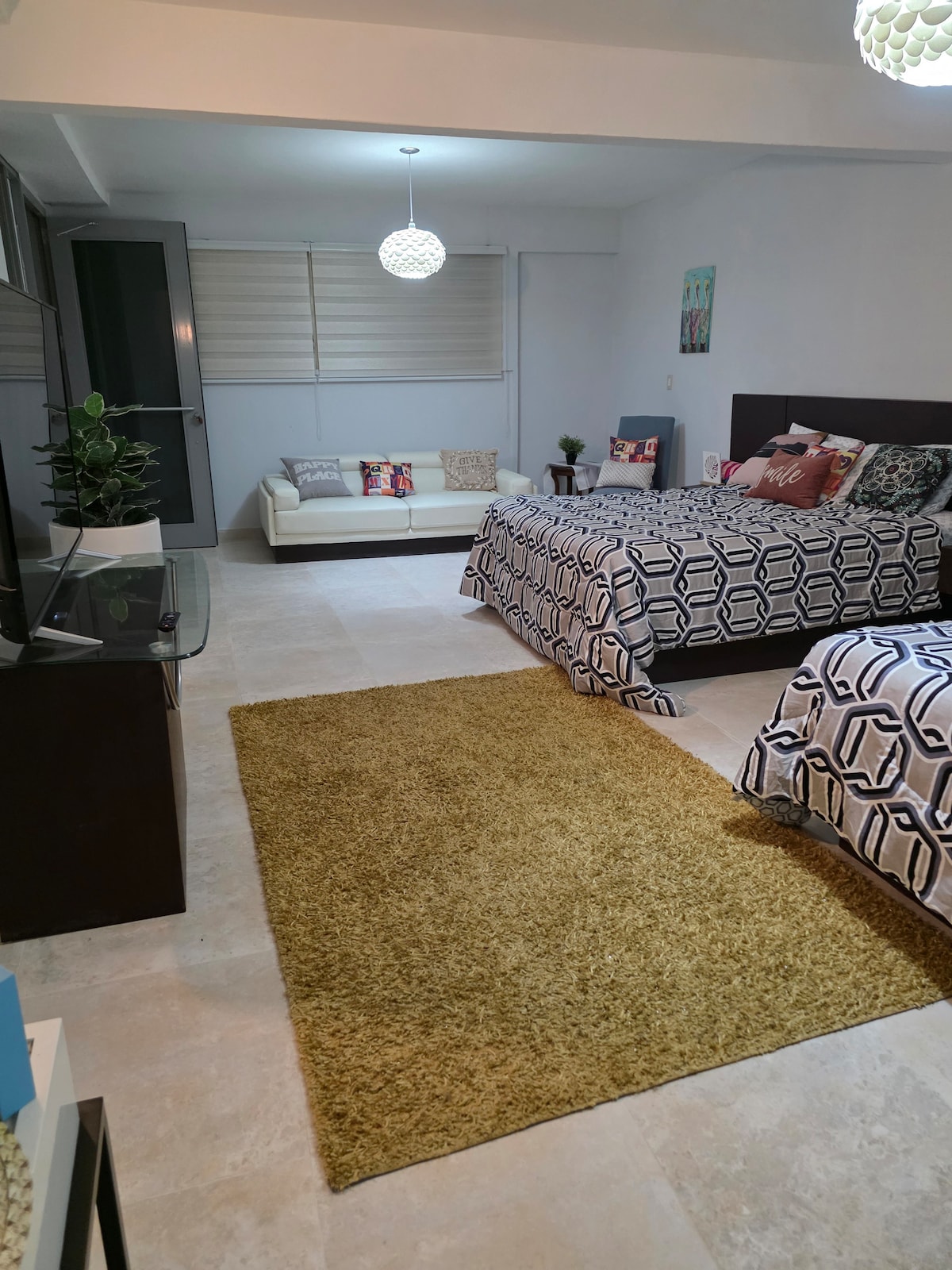 Piscina/Playa/Restaurantes - propiedad con habitaciones privadas, baño privado/calentador de ducha. Esta habitación tiene su llave y entrada independiente. Dos camas queen, unidad de aire, Smart TV, WiFi; NO COCINA. El huésped sí puede traer su nevera de playa. Sí hay microonda ubicado en un àrea común. En las facilidades hay una piscina. Esta piscina no es privada de una habitación. Hay disponible estacionamiento dentro de las facilidades.