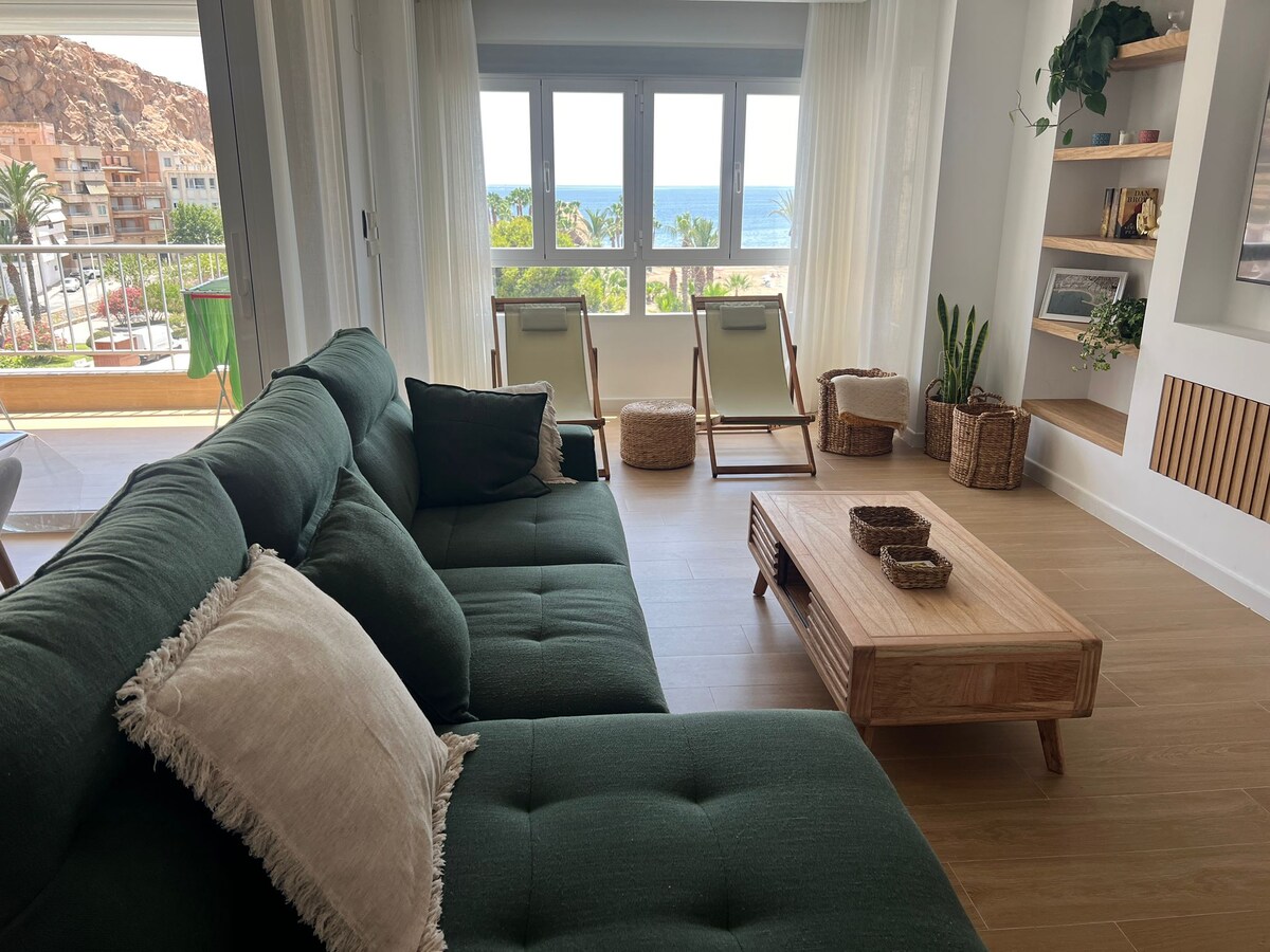 アルメリア県プエルトレイのビーチフロントにあるポーチ付きの低層アパートメント。 2つの寝室、リビングルーム、バー付きキッチン、バスルーム、ランドリールーム、収納。エアコン、ソファーベッド、Wi-Fi、55インチスマートテレビ(NetflixとAmaon Prime)、洗濯機と乾燥機。キッチンには電子レンジ、食器洗い機、調理器具が完備されています。メインの寝室には160cm幅のダブルベッド1台、2番目の寝室には90cm幅のベッド2台があり、どちらの寝室にもクローゼットがあります。 屋外の専用駐車場。共用プール。