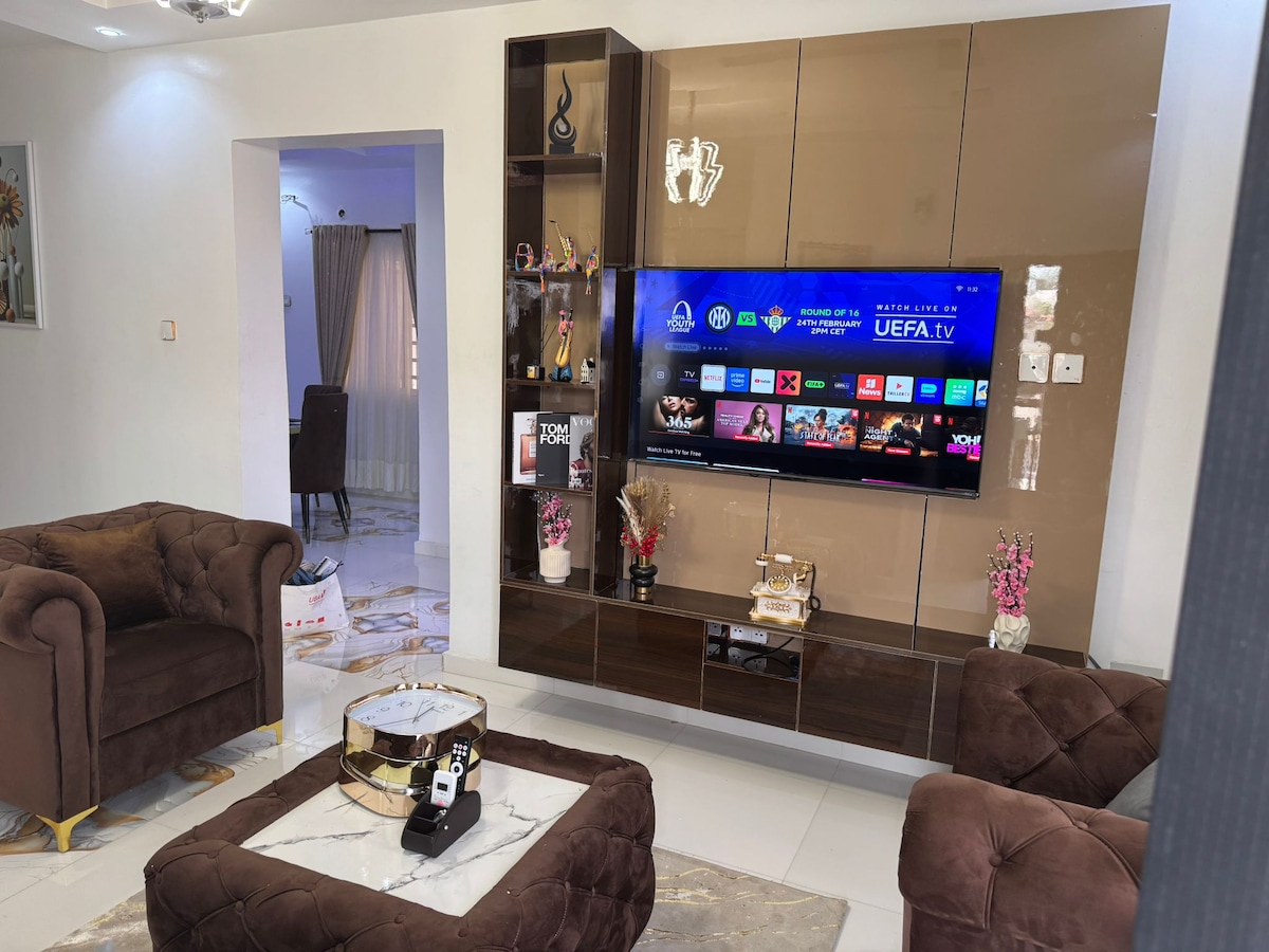 アパートには、エアコン、キッチンキャビネット、電子レンジ、冷蔵庫、洗濯機、タイル張りの床、スマートテレビ、ワードローブが備わっています。電源:太陽光、インバーター、NEPA、プリペイドメーター、発電機。Wi-Fiは月額₦30,000(ゲストの負担)でご利用いただけます。 電源: 24時間365日電気。インバーターはエアコンや冷蔵庫に電力を供給しません。ゲストは発電機に燃料を供給します。 損傷がなければ、返金可能な30,000ナイラの保証金が適用されます。よろしくお願いします。
