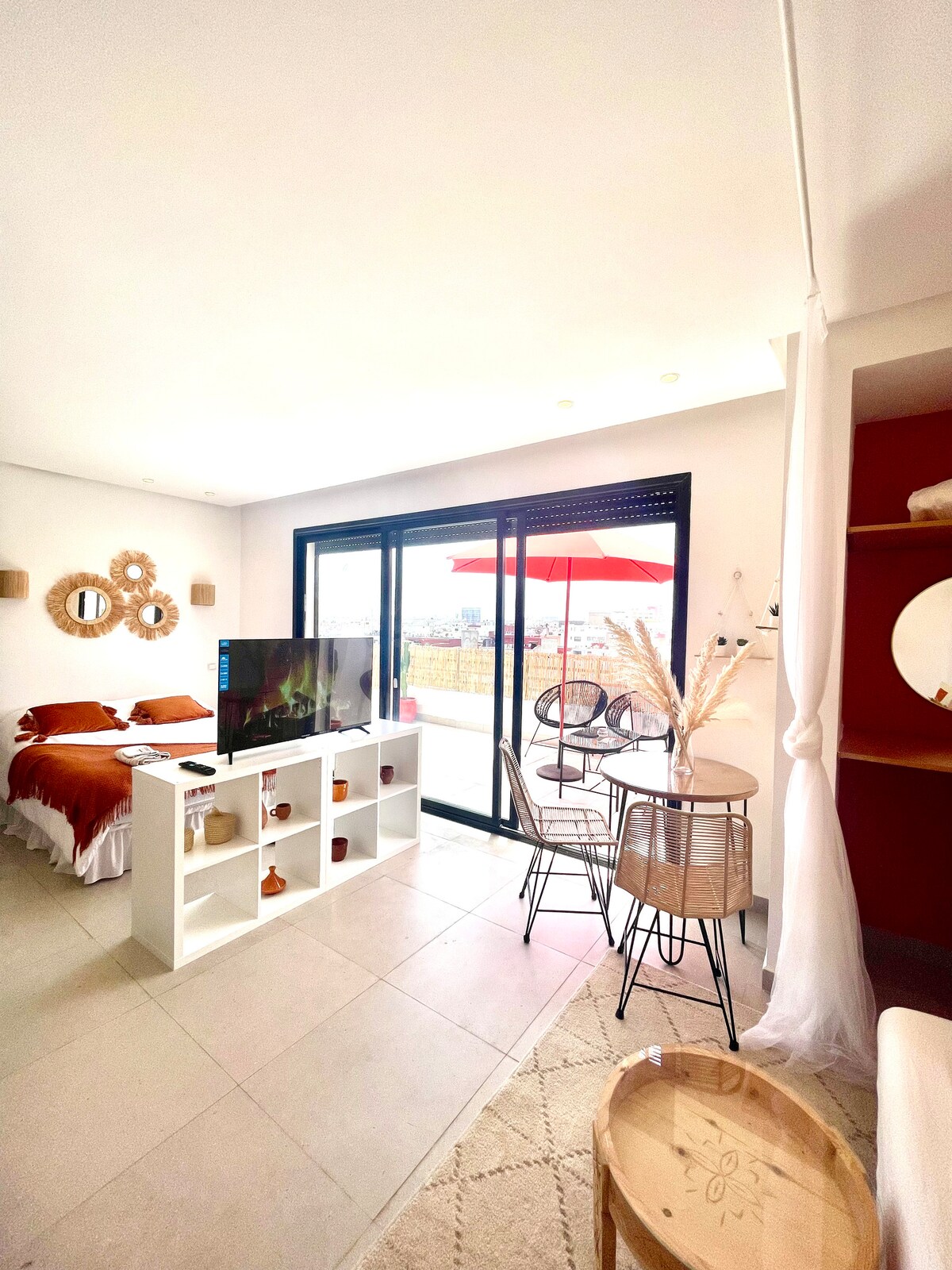 Charmant studio au cœur de Casablanca avec une vue dégagée et terrasse ensoleillée. Idéalement situé en plein centre-ville de Casa, ce studio au 7ᵉ étage vous séduira par son ambiance chaleureuse et sa décoration raffinée inspirée du style merrakchi. Sans vis-à-vis, il offre une grande terrasse baignée de soleil toute la journée, parfaite pour se détendre ou partager un repas en plein air. Le studio allie confort moderne et touches artisanales, créant un cocon accueillant en plein centre urbain.