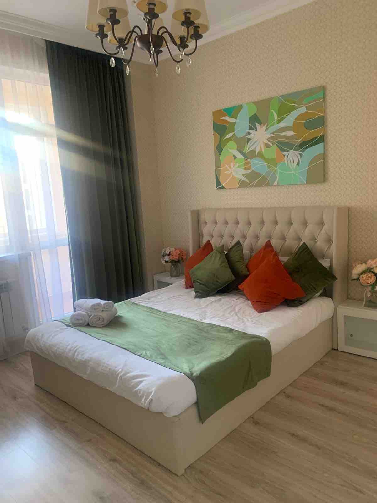 Новая двухкомнатная квартира в центре г.Астана, расположенная вблизи Ботанического парка, ЭКСПО. Вход в апартаменты по индивидуальному коду. Гостям предоставляются тапочки, одноразовые принадлежности (шампунь, гель для душа, ватные диски, ушные палочки и т.д.), фен, Smart TV, кондиционер, WiFi. Кухонная зона со всей необходимой бытовой техникой: посуда, микроволновая печь, плита, чайник, холодильник.