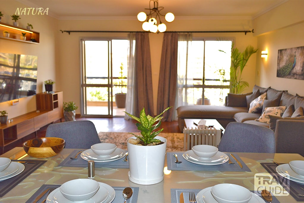 広い庭園を見下ろす、静かでリラックスできる立地にある、スタイリッシュなボーホースタイルの2寝室アパート。穏やかで快適な滞在に最適です。 スマートテレビ3台をお楽しみください:65インチスクリーンが2台(リビングルームとマスターベッドルーム)、50インチテレビが1台(第2寝室)。すべてストリーミングサービスが利用可能です。さらに、超高速で安定したWi-Fiも完備しているので、リモートワークや映画鑑賞にも最適です。 ニューカイロのエル・レハブ内にあり、ゲートウェイ・モールからわずか数分の最高の立地で、近くにはカフェ、レストラン、ショップがすべて揃っています。