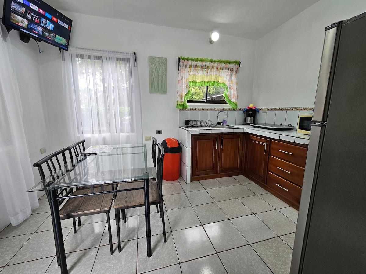 Comfortable and affordable apartment located just 1 mile from downtown La Fortuna by Pali Supermarket. This one is located in the first floor of the building with two bedrooms each one with a full bed, A/C unit, Smart TV, WiFi (100 megabytes), private bathroom with hot water, kitchen, living/dining room, private parking. Walking distance to town, it will take about 15 minutes to the central park in a very secure neighborhood.