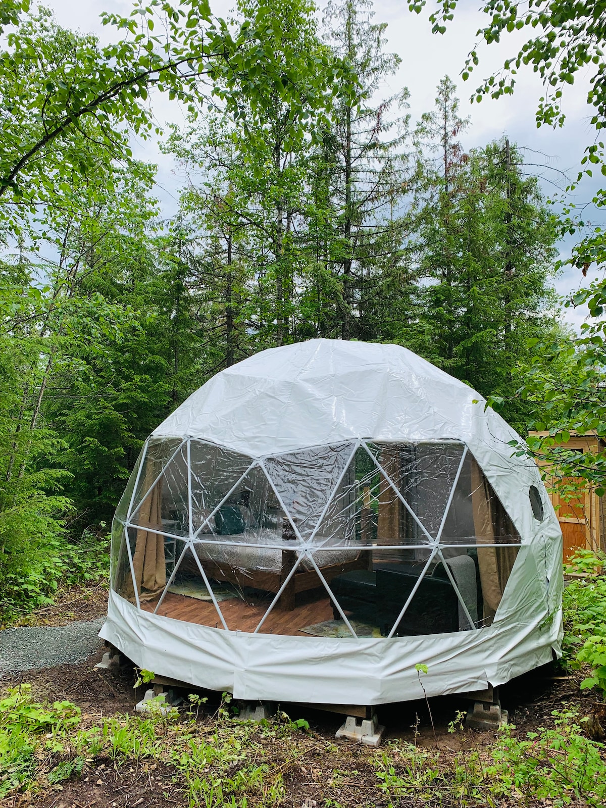 ロマンチックなジオドームで最高のグランピングを! ノースシャスワップにある私たちの静かで平和な「オフグリッド」ジオドームで、空を眺めながら眠りにつきましょう。 私たちの広大な敷地はほとんど未開発ですので、自然に戻り、人里離れたシャスワップ・パラダイスを楽しむことができます。 公共ビーチまで車で2分、徒歩30分です。 ジオドームのグランピングは素晴らしいです。田舎でのキャンプに慣れており、自然とのつながりを取り戻したい方に最適ですが、明確に言うと基本的には森の中のテントです。