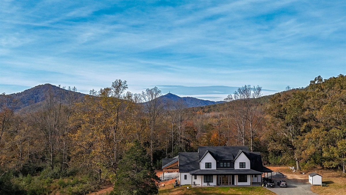 ブルーミングデールのハニームーンキャビンから山と納屋の景色を楽しめます