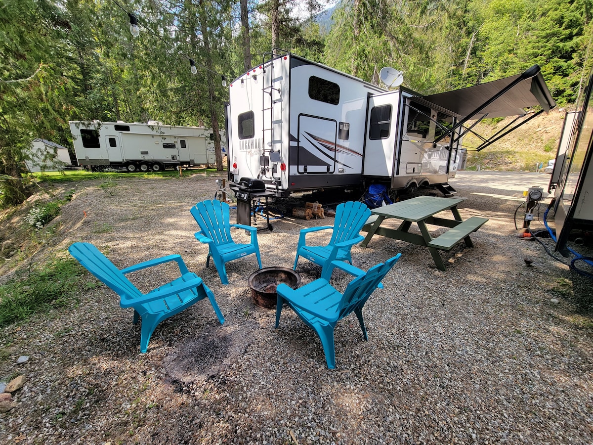 休暇にぴったりです! 明るく、暖かく、快適で、山に囲まれた新しい4シーズン5th wheelです。 このスペースはプライベートな場所にあり、フルキッチン、バー付きの屋外キッチン、シャワー付きのバスルーム、プロパン暖房、40インチテレビ、Netflix、Wi-Fi、電気暖炉、屋根付き駐車場、大きなデッキを備えています。 ドアからすぐの場所には、カスタムメイドの薪暖房式ジャグジーもあります。 ネルソンのダウンタウンまで車で5分、ホワイトウォータースキーリゾートまで20分です。