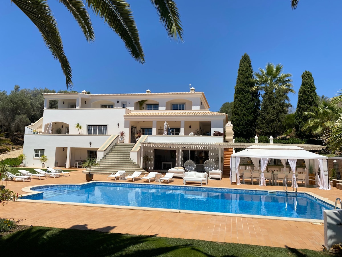 Ochre walls and green gardens make this typical Portuguese mansion a vibrant retreat. Its verdant grounds, tiled rooms, and 7 bedrooms, including 2 in 2 guest houses, are a welcoming place to host a family reunion in the Algarve. While there are plenty of beaches near the villa in the Portimão area, it’s also a short drive to the old town and beaches of Lagos. With a rural setting amid farmland and gardens planted with fruit trees and flowering vines, the villa feels like your own private country estate. Savor the quiet and the sunshine from a lounger by the outdoor swimming pool and linger beneath a palm tree at the alfresco dining table. Your holiday includes daily breakfast, and a housekeeper will make sure you’re comfortable. The living areas at this vacation rental are spread out between a main house and 2 guest houses, but all feature a mix of refined modern pieces and colorful prints. Look for details like mustard-yellow tile around the fireplace, sea-blue cushions on the dining chairs, and brilliant tile on the floor of the fully equipped kitchen. Each guest house also has its own kitchenette. Drive less than 20 kilometers from the villa to 3 different beaches, including the Alvor boardwalk and the top-ranked Praia de Marinha Beach. Head for the nearby port city of Lagos to explore cobblestone streets running beneath 16th-century walls and pause at one of its lively restaurants. Copyright © Luxury Retreats. All rights reserved. BEDROOM & BATHROOM • Bedroom 1 - Primary: King size bed, Ensuite bathroom with stand-alone rain shower and bathtub, Air conditioning, Safe • Bedroom 2: Queen size bed, Ensuite bathroom with stand-alone rain shower, Air conditioning, Safe • Bedroom 3: 2 Twins size beds (can be converted to a king), Ensuite bathroom, shower/bathtub combo, Air conditioning, Safe • Bedroom 4: 2 Twin size beds (can be converted to a king), Ensuite bathroom with stand-alone rain shower, Air conditioning, Safe • Bedroom 5: Queen size bed, Ensuite bathroom with stand-alone rain shower, Air conditioning Guest house • Bedroom 6: 2 Twin size beds (can be converted to a king), Ensuite bathroom with stand-alone rain shower, Kitchenette, Lounge area Guest house 2 • Bedroom 7: King Twin size beds, Ensuite bathroom with stand-alone shower, Kitchenette, Lounge area FEATURES & AMENITIES Extra cost (advance notice may be required): • Activities and excursions • More under “Add-on services” below