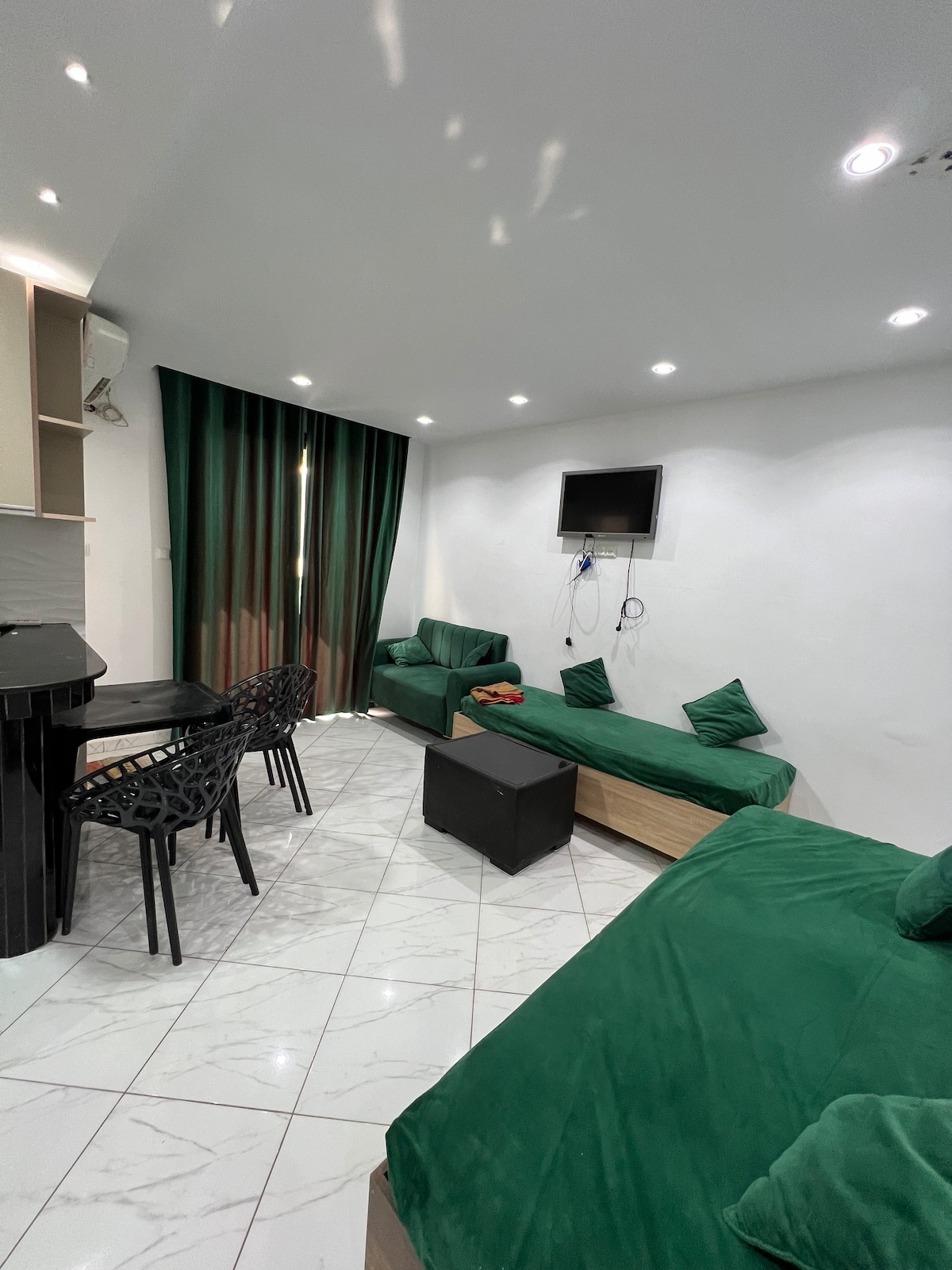 この静かな宿泊施設は、家族全員でのんびり過ごせる場所です。中庭と庭園をご利用いただけます。空港、ショッピングセンター、クリニック、ビーチなど、あらゆる施設に近接しています。 空港とアパート間のシャトルバスは5ユーロでご利用いただけます 毎朝、2ユーロから10ユーロの様々なプランの朝食をご用意しております。事前予約が必要です。 ユーロの両替は当日のレートで可能です カップルの方は家族登録簿が必須です。よろしくお願いいたします。