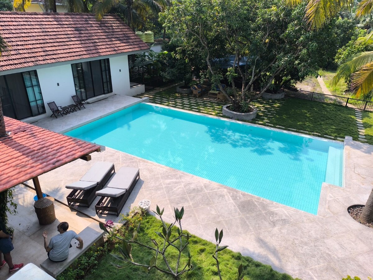 この3ベッドルームは超豪華で、ゲスト専用です。客室にはエアコンと光ファイバーWi-Fiが備わっています。徒歩7分のビーチと徒歩圏内のレストランがあります。発電機とインバーターを稼働させています。屋外・屋内スポーツ、トランポリン、自転車、テーブルテニス、カロム、バドミントン、音楽システム、バーベキューなどがたくさんあります。フルサイズのプール、スタッフ用の宿泊施設、騒がしい隣人はいません。ヴィラはスーパーホストに選ばれており、制限はありません。子ども連れにとても適しており、8人まで宿泊できます。屋外スペースがたくさんあります。階段はほとんどありません。