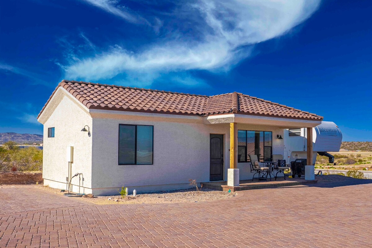 Mustang Trail Ranch Casita. Single family private horse property on 4 acres along the Hassayampa river overlooking Wickenburg. Private guest tiny home casita in natural desert setting and free parking. Full frontal deck allow open air living with gorgeous views! Beautiful, secluded neighborhood next to Remuda Ranch and near Rancho Rio roping arena. Horse corral and trailer parking available. Plenty of space to explore and quick access to desert. Many trails for horse, bike, RV, etc.
