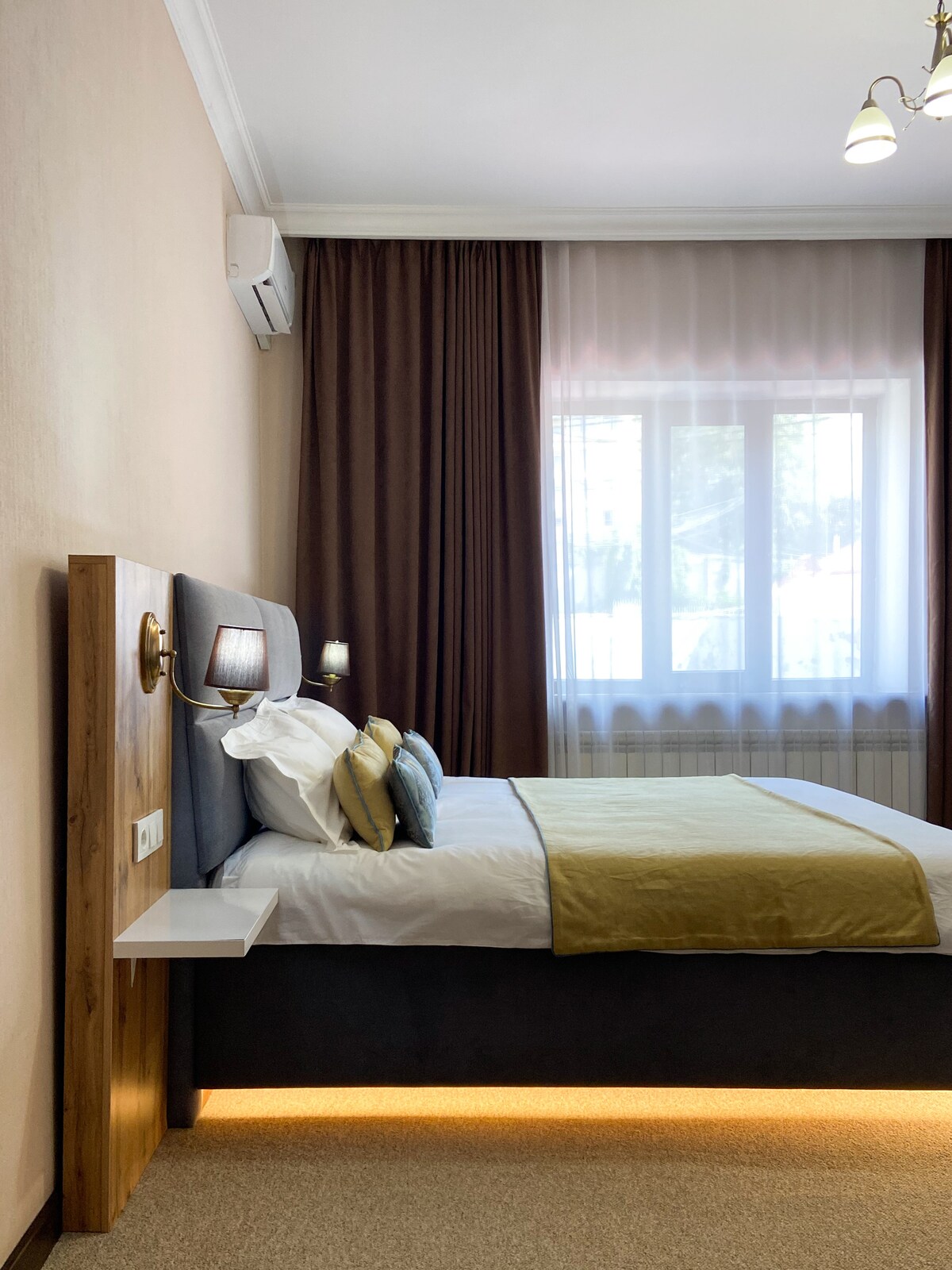 Welcome to a bright 2-bedroom, 2-bath apartment in Almaty’s Golden Square secured residence, 20 minutes ride from the airport. Fine restaurants, supermarkets, and attractions are steps away. Thoughtfully designed with natural wood and ceramic floors, it stays cool in summer and warm in winter. It has calm and elegant vibe. The apartment features layered lighting, a workspace, washing machine, Nespresso machine and dishwasher. Breakfast available for an extra fee — perfect after a long trip.
