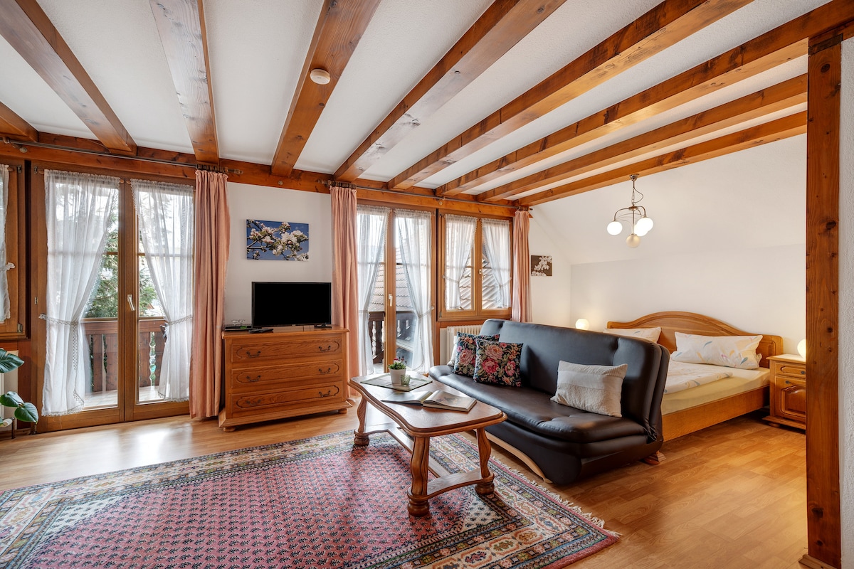 The Room Zimmer 3 Einzelzimmer mit Balkon is located in St. Blasien and boasts direct access to the ski slopes. The 2-storey property consists of 1 bedroom and 1 bathroom and can therefore accommodate 1 person. Additional amenities include high-speed Wi-Fi (suitable for video calls) with a dedicated workspace for home office as well as a TV. Enjoy the shared outdoor area which includes a garden and covered terrace. Public transport links are located within walking distance.