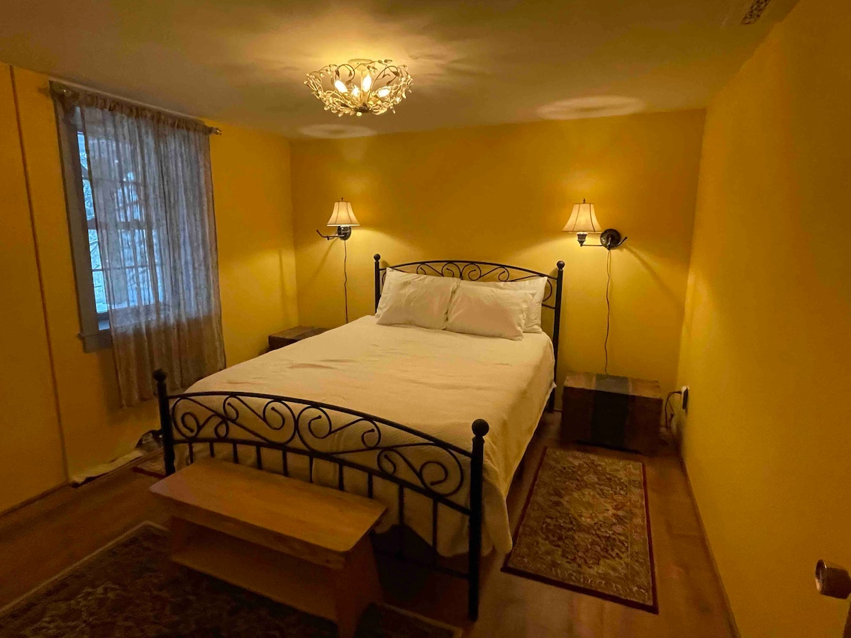 This room is one half of a floor in our studio building (35 sq m). It is the only occupied space in the building, which is separated from the main house by a yard. There is a queen-sized bed, full bath (no-curb shower), and an outdoor shower (not available in the winter) Small kitchen with a sink, fridge, 2-burner induction hob, microwave/convection oven, toaster, coffee pot, and cookware. Arched ceiling, with ceiling fan, large windows, deck, and Maggie's botanical art lining the walls.
