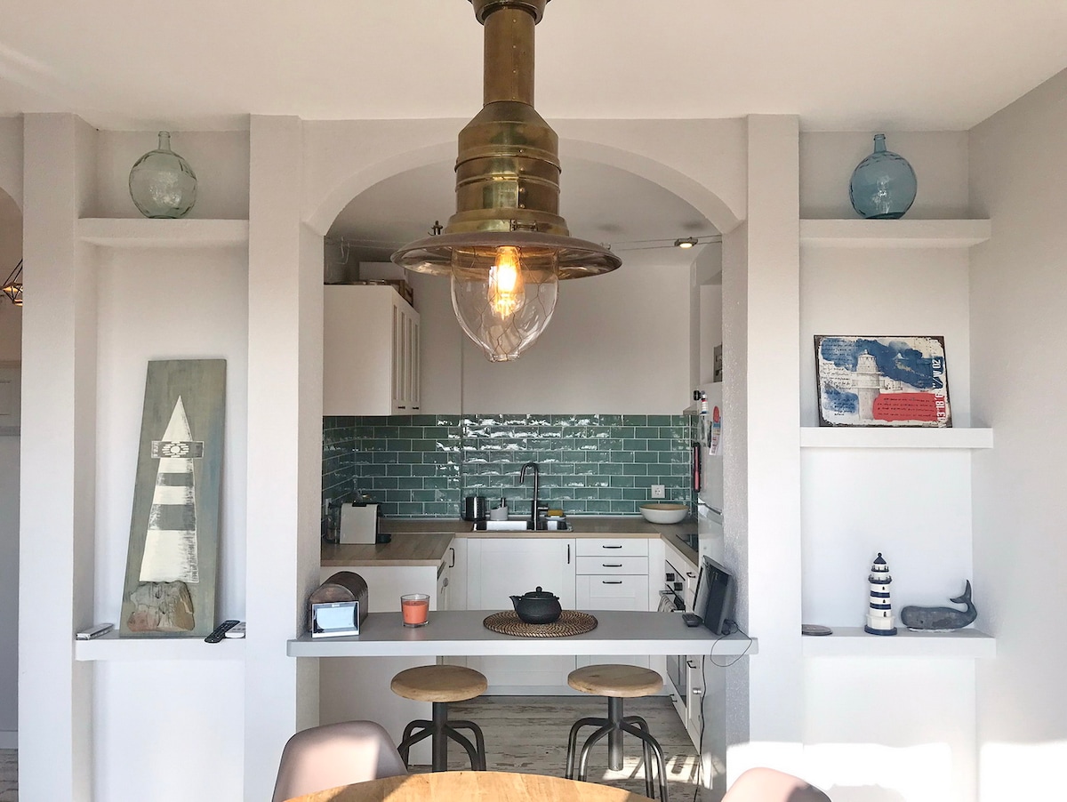 自然光が差し込み、海の景色が楽しめる、明るく快適なアパートです。 🛏️ ダブルベッドまたはツインベッドを備えた寝室と、追加のゲスト2名様用にソファベッドを備えたリビングエリア。 🍳 設備が整ったキッチンには、調理器具、コーヒーメーカー、トースター、ケトル、清掃用品が揃っています。 🛁 シャワーまたはバスタブ、緑茶のトイレタリー、ヘアドライヤーを備えたバスルーム。 📺 テレビ、Wi-Fi、エアコン、金庫、ベッドリネン、タオルが含まれます。リラックスできる専用テラス。 夏季には、ビーチパラソルとタオルをご用意しています。