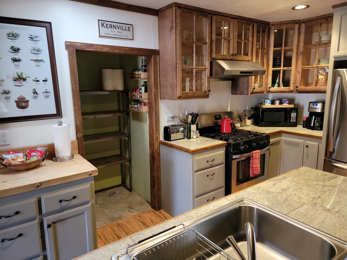 Moonpine Kernvilleは、シエラネバダ南部にある素晴らしく清潔で豪華な隠れ家です。町まで1マイル未満です。家と庭の中から美しい山と谷の景色が楽しめます。広々としたマスターベッドルームには、アーチ型の天井と大きな窓、専用のワークスペースがあります。新しいセントラルエアコンと暖房!設備の整った大型キッチン。高速Wi-Fi 300mbps!庭には美しい新しいコンクリートの景観があり、リラックスして新しいガゼボのソファで素晴らしい景色を楽しむのに最適な場所です!