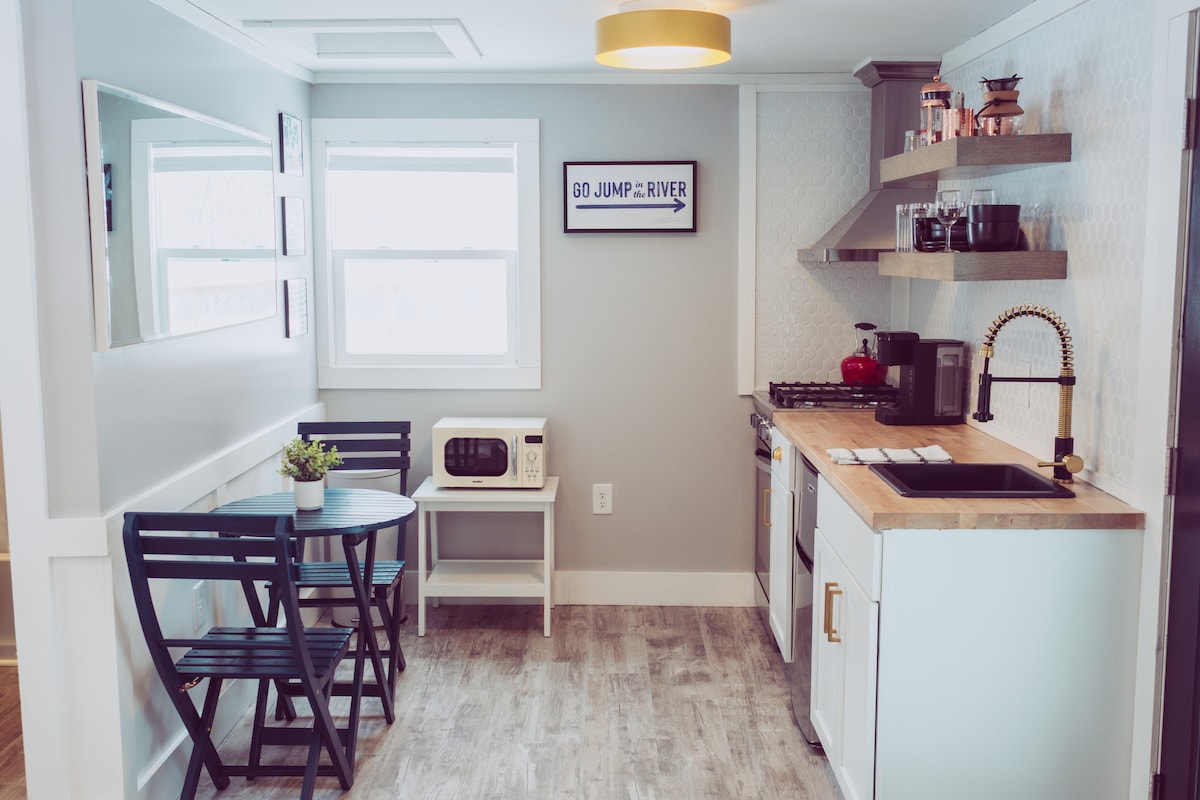 That Tiny House on the River is a destination where intimate elegance harmonizes with the natural beauty of Big Sable River’s serene shores, only steps from the house. Nestled between Ludington and Manistee, this modern, bespoke tiny home offers a personal retreat just a stone’s throw from the sandy beaches of Lake Michigan, less than 15 minutes away. If you're looking to step out of the day-to-day and over to Michigan's west side, That Tiny on the River will not disappoint.