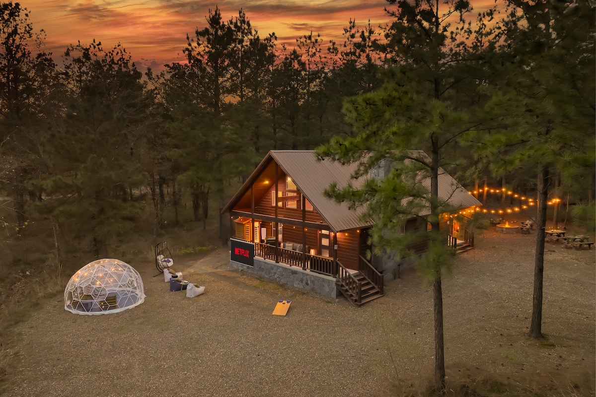 Our cabin offers the ultimate escape for those seeking privacy and tranquility. We also have amenities galore for different age groups. ⛳️ Zipline, Mini golf,Slide, Swings,Hammock 🎬 Movie Theater 💦 Seasonal Creek 🛁 Big Hot Tub + Barrel Sauna 💺 Massage chair 🛏️ 2 Kings + Bunk- Sleep 10 🥅 Foosball, Pool Table & Shuffleboard 🕹️ Corn hole +Arcades 🔥 Fire-Pit 🍳 Fully Equipped Kitchen