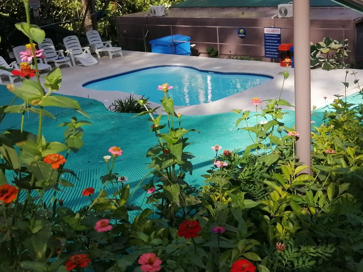 Habitación tipo cueva de cemento y piedra en un bosque. Está rodeada de naturaleza, árboles altos y hay un río muy cerca. Hay agua potable, ducha con agua caliente y electricidad. Está ubicado a 30 minutos del centro de Pérez Zeledón en San Pedro. Lugar Topolandia.