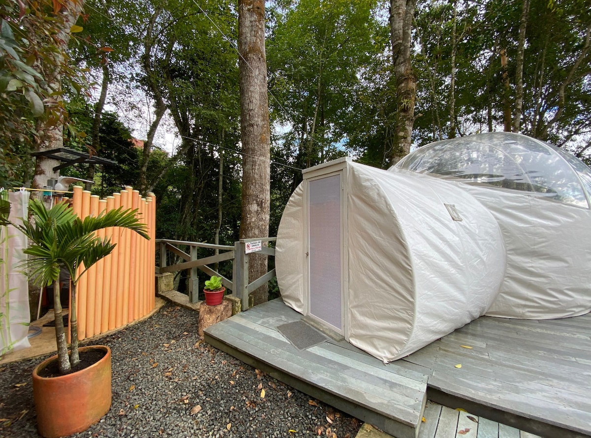 「Cerquita del Cielo」のグランピング-大人のみ 雄大な自然の中、百万の星の下で眠り、鳥のさえずりと滝の音で目を覚ます。太陽光と湧き水を使った100%持続可能なガラスのイグルーです。 料金に含まれるもの: -サンタアナからの往復交通費。風力発電所ツアー -滝へのツアー。 -調理器具を備えた専用バーベキューエリア -夕暮れ時の展望台 -専用のツリーネット -専用ジャグジー(ハイドロマッサージ) -朝食ルームサービス