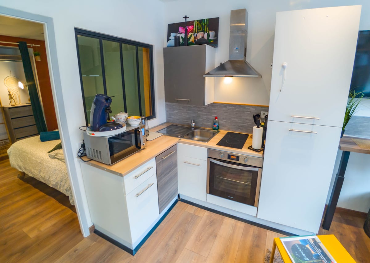 14m2のフル装備の完全独立型スタジオは、私有住宅の庭にあり、次のものが含まれます:食事スペース付きのキッチン(IH調理器、冷蔵庫/冷凍庫、電気ケトル、カプセル式コーヒーマシン、電子レンジ、調理器具)、ダブルベッド、シャワー、トイレ、洗面台、テレビ、アダプターによる高速Wi-Fi。 スタジオにはラジエーターがあり、シーツとタオルが含まれています。 静かで明るい通りに無料で駐車できます。