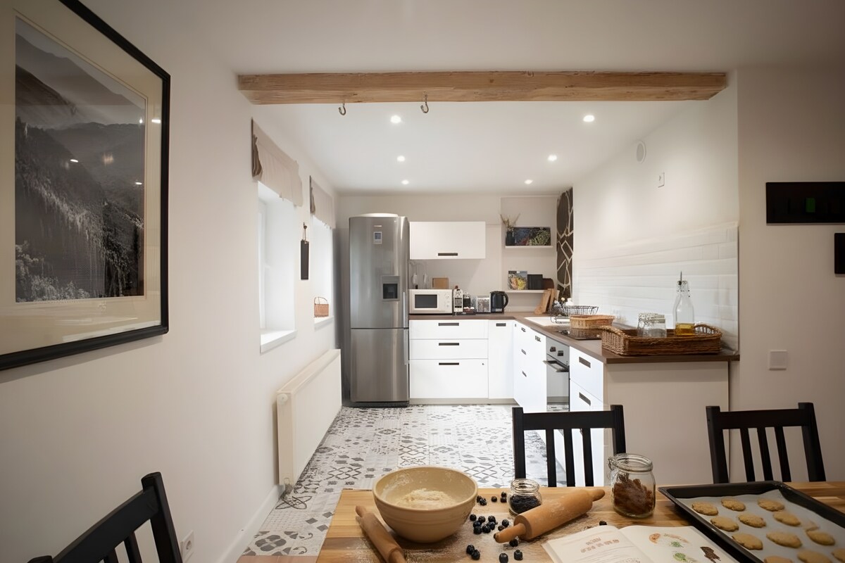 静かでスタイリッシュ、かつモダンなこのアパートは、のんびり滞在するためのすべてが揃っています。 快適なベッド(160 x 200 cm)と城の景色を望む専用テラスがあり、リラックスした滞在をお楽しみいただけます。 設備の整ったキッチンでは料理を楽しめ、洗濯機を備えたモダンなバスルームではさらに快適に過ごせます。 無料駐車場と電動自転車用の駐車スペースをご利用いただけます。 静かで高品質な家具を重視するゲストに最適です。