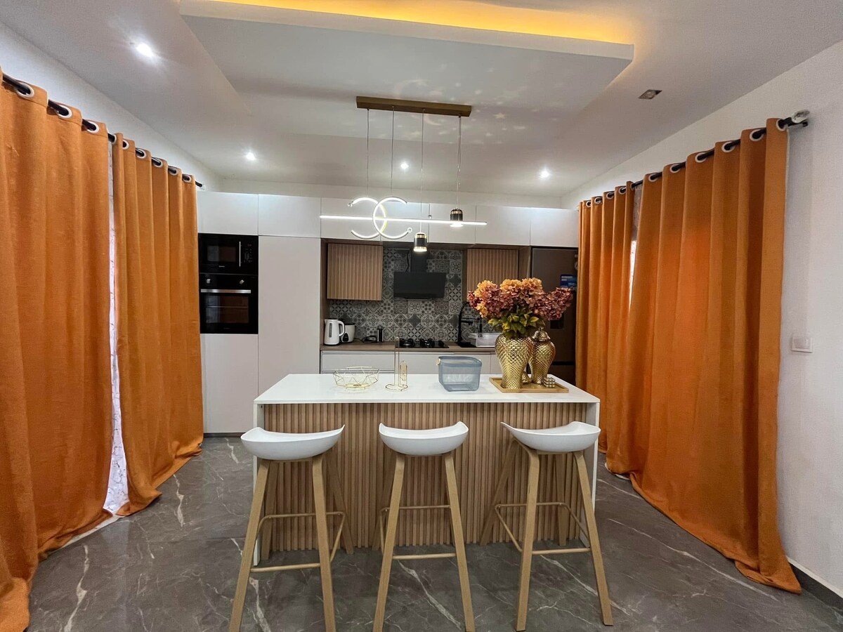 Résidence Calme. Un havre de paix pour s'évader de la vie quotidienne. Offrez vous un séjour inoubliable. Nous disposons de 2 suites climatisées, 1 chambre ventilée avec salle de bain attenante. Une cuisine intérieur équipée ouverte sur un salon spacieux. Un espace extérieur zen offrant une grande terrasse couverte sur une piscine, une cuisine exterieure bien équipée avec barbecue. Bien évidement femme de MÉNAGE, WiFi, TV et Gardiennage inclus.
