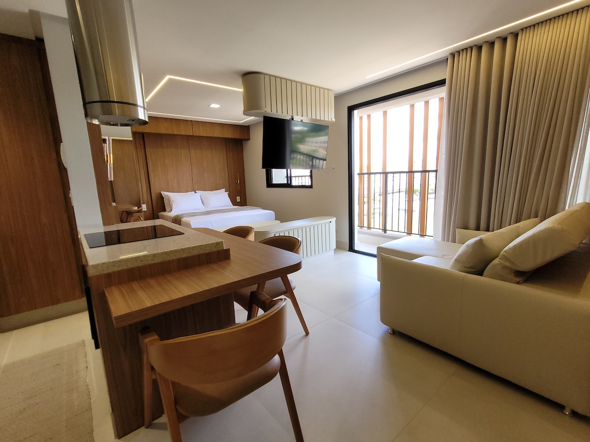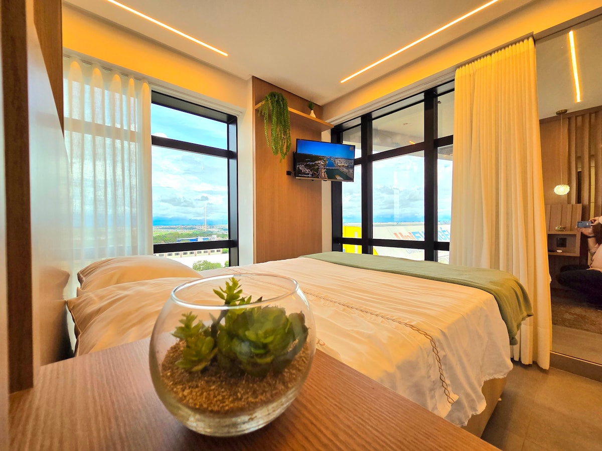 Studio premium no Hit Sky Club, um dos condomínios mais completos e desejados de Anápolis, em frente à UniEVANGÉLICA, com vaga de garagem privativa e piscina rooftop 24h com vista panorâmica da cidade. Estrutura moderna com academia, coworking e segurança. Espaço elegante, funcional e bem equipado: cama confortável, sofá de couro, ar-condicionado, Wi-Fi rápido, Smart TV e cozinha com fogão de indução. Ideal para quem busca localização estratégica, conforto e alto padrão em uma única experiência.