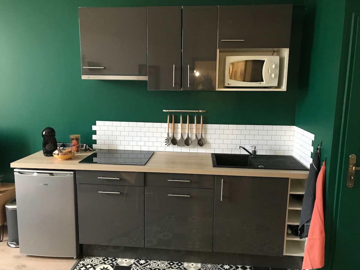 私たちの庭の奥にあるワンルーム:キッチンエフ、ナイトチエフ、大きなドレッシングルーム、バスルーム(大きなシャワー/トイレ)。 注意:鍵ボックスはありません(内部規則の時間帯を参照)。テレビはありませんが、Wi-Fi は😉良好です。 電車の通過(夜間に多い場合あり)以外はとても静かです。 路上駐車場無料。