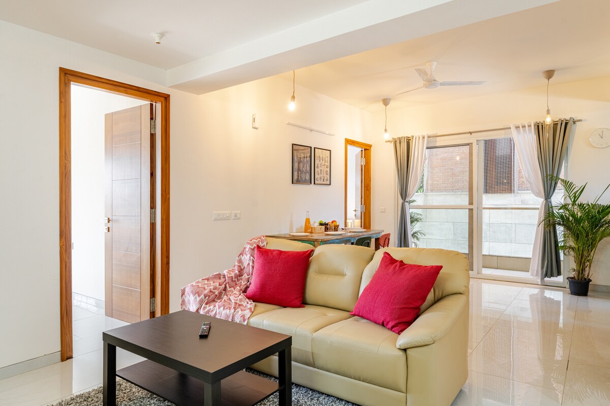 Spacious 600 square feet Designer 1BHK Suite with Private Balcony | High-Speed fibre optic Wi-Fi & Smart TV with streaming platforms, Work/Dining Desk, 24/7 power backup for uninterrupted work and comfort |Luxe King Bed & Orthopaedic Mattress ,wooden wardrobes for storage | fully equipped Kitchenette | Couch Bed in living room , Max.Occupancy 4 | Elevator access, professional housekeeping and access to paid laundry on site for long stays| Located in Central Bangalore | LGBTQIA++ Affirmative