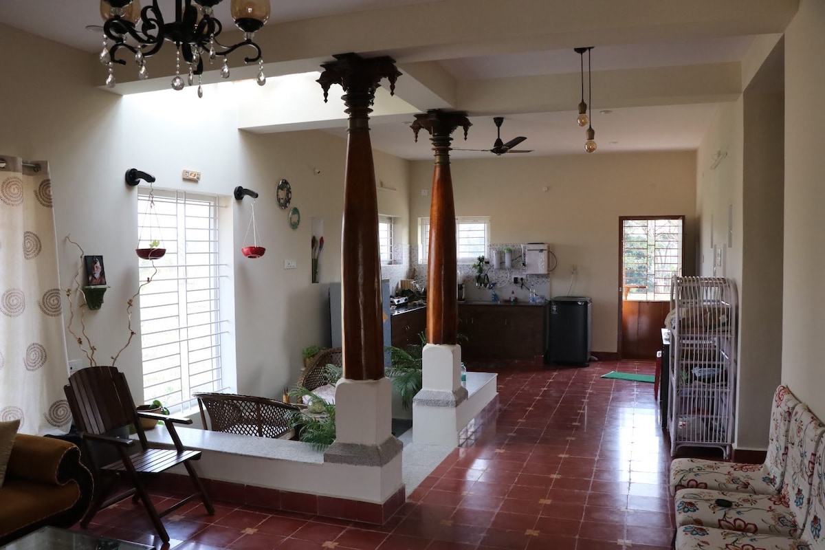 Stay in a private villa on a 0.5-acre property that's entirely yours. Great for friends / small families. Serene location 800m from YMCA Yelagiri and 15 min from town centre. (DM for offers on 3+ nights) - Big compound with lush green lawns, trees - Sunrise views over the hills - Fast Wi-Fi + 4G dongle backup - AC bedroom, RO water, hot showers - Full kitchen with fridge, stove & utensils - Inverter + solar lamp = uninterrupted outdoor lighting - Sleeps 7 comfortably - Campfire on request (DM)