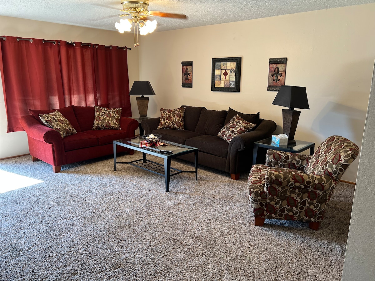 近くで働いていて、ミッドランドやオデッサの喧騒の中に滞在したくないですか? アンドリュースの中心部に位置し、手入れが行き届いた古いエリアにあります。20フィートx 30フィートの屋根付きパティオには、ジャグジー、ビリヤード台、ダーツボード、65インチテレビ、サラウンドサウンド、追加の冷蔵庫があります。仕事で1日が終わった後にリラックスして過ごすのに最適な空間です!屋根付き駐車スペースが3台分あります!シフト勤務の男性たちが一緒に滞在するのに最適な場所です。