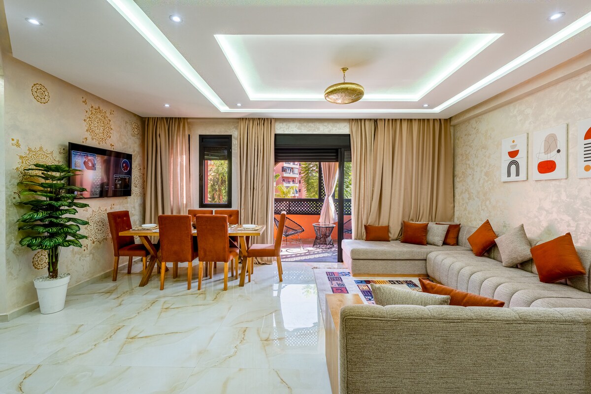 マラケシュの中心部、ウィンターナージュ地区にあるこの素晴らしいアパートの快適さをお楽しみください。 デザイン性、快適さ、高い機能性に加えて屋上プールもあり、日常から離れたユニークな体験ができます。この素晴らしいアパートは、マラケシュの中心部にある静かで快適な休暇に最適な場所です。 光ファイバーインターネット100メガ 目を閉じて借りる。 注意:モロッコ人または混血のカップルは、到着時に結婚証明書を提示する必要があります
