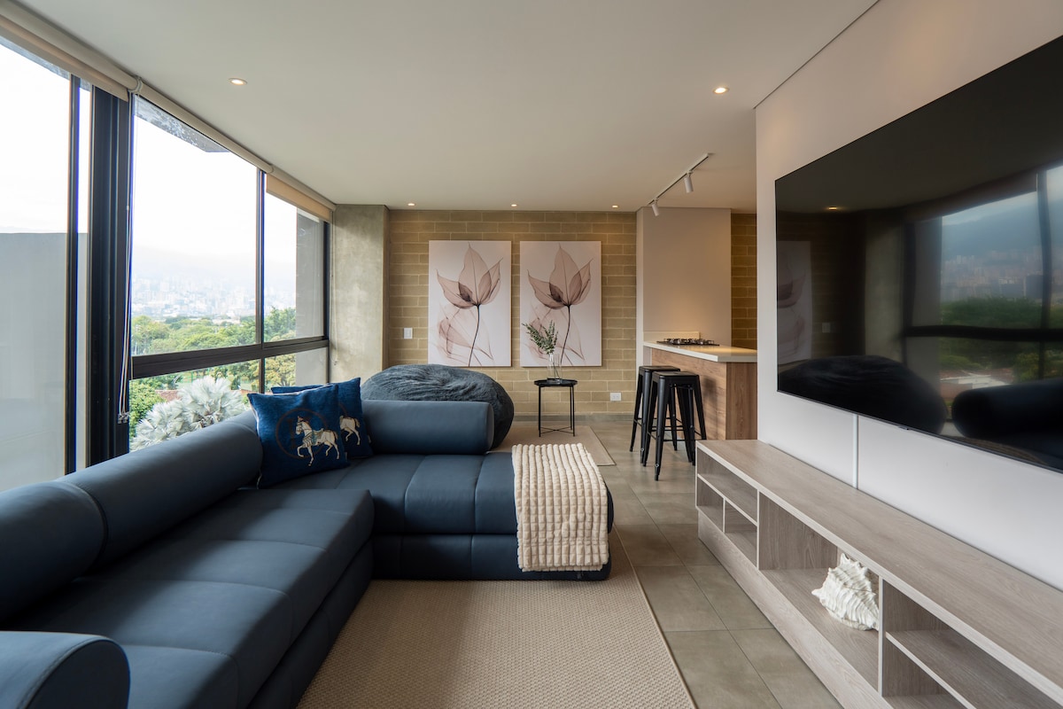 これはエネルギーリビングです。メデジンの建築賞を受賞した象徴的な建物です! この18階のアパートは、建物の中で最も高い階で、テラスと素晴らしい街と山の景色が楽しめます! アパートには、床から天井までのガラス、リビングルームとマスターベッドルームには独立したエアコンユニット、ジャグジータブと電動オーニングを備えた広いバルコニー、電動ブラインド、60インチウルトラHD 4 Kテレビ、超高速300 MB WIFI、マスターベッドルームにはキングサイズベッドとソファベッドがあります。 屋上プールとスパ、スチーム、ジム!