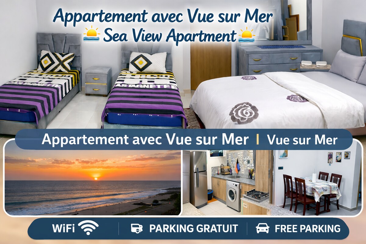 Profitez d’un séjour agréable dans ce bel appartement lumineux et soigneusement aménagé, offrant une magnifique vue sur la mer il se trouve à seulement 5 minutes à pied de la plage vous permettant de profiter pleinement du littoral sans avoir besoin de transport. L’appartement est propre, confortable et entièrement équipé pour répondre à tous vos besoins, que ce soit pour un séjour de détente ou de travail. Le quartier est calme, sécurisé et proche de toutes les commodités commerces, cafés