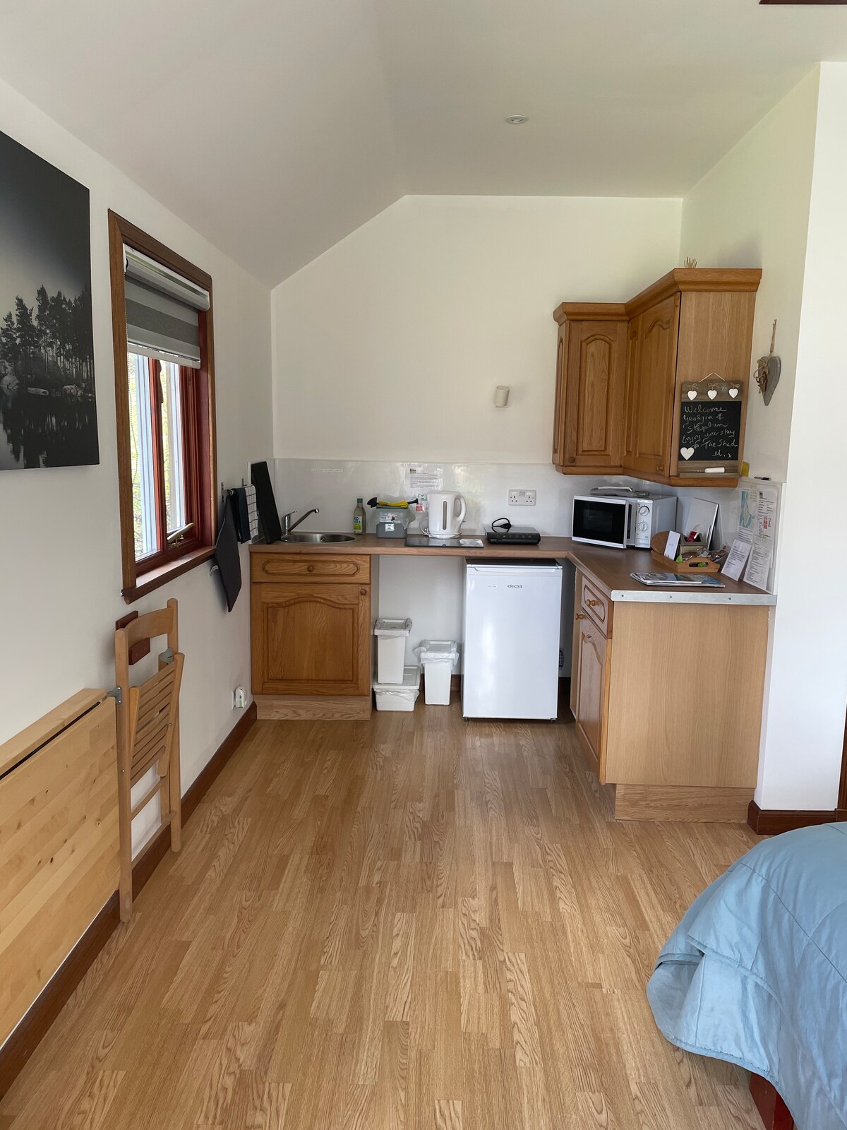Set at the end of a quiet track within the grounds of our home, this cosy garden annex offers a peaceful winter retreat for two. Warm and comfortable, it features an open-plan kitchen and living area with sofa, dining table and TV, plus patio doors opening onto a private deck. The bedroom has a double bed and good storage, with a compact bathroom and shower. Just a 10-minute walk from Tralee Beach and a short drive to Oban, it’s ideal for quiet winter breaks or longer off-season stays.