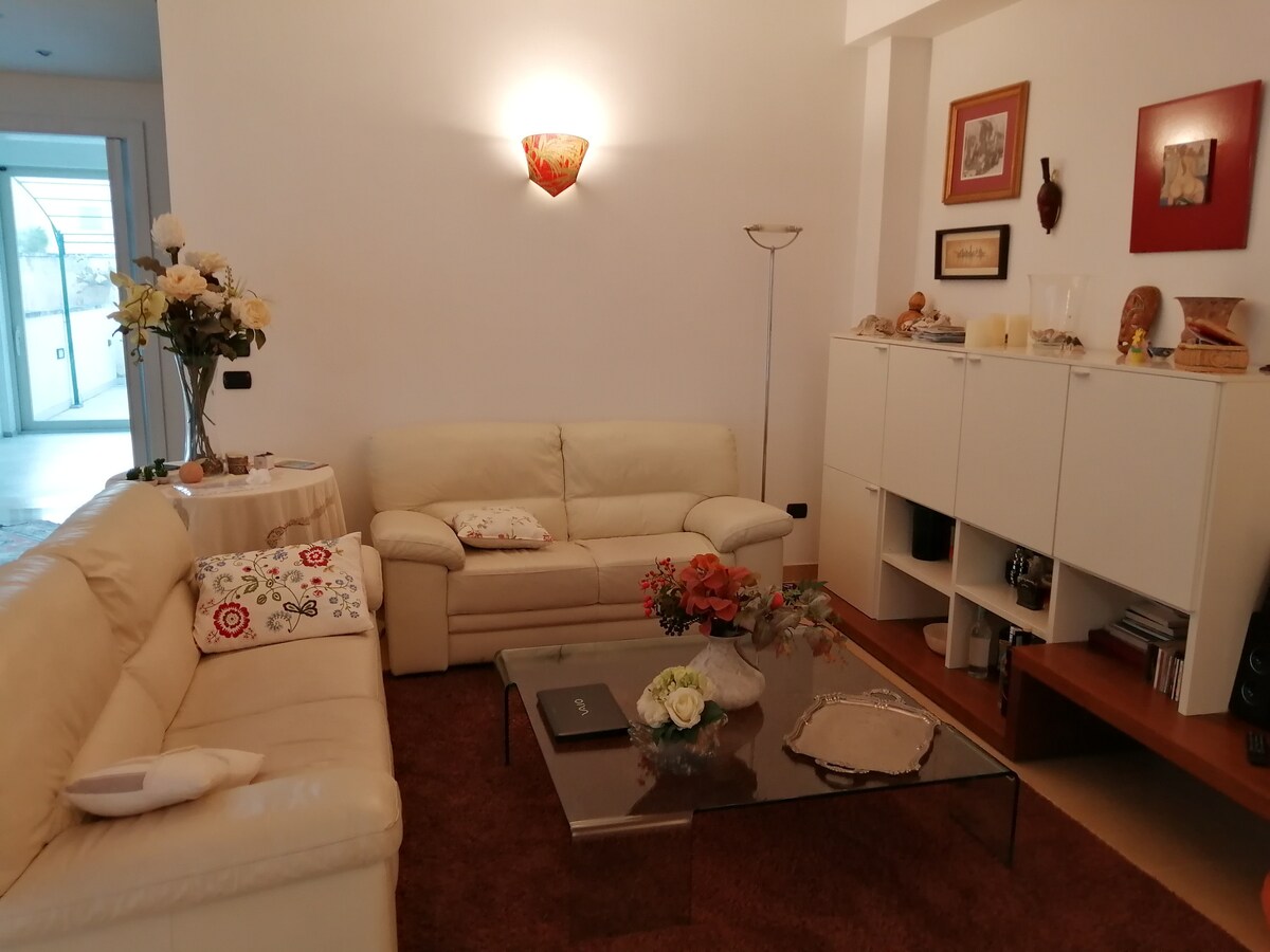 マッツィーニ広場エリアのアパート。 1階は車椅子でアクセス可能で、床には大きなエレベーターがあります。 ダブルベッドルーム2室、シャワー付きバスルーム2室、ダブルソファベッドを備えたリビングルーム、明るいキッチン、新鮮な朝食やキャンドルライトディナーに最適な広い屋内テラス、中庭を見渡すバルコニー。 料金には、中庭にあるダブルガレージまたは駐車スペースが含まれています。 ゲストはウォーキング用自転車とトレッキング用自転車をご利用いただけます。空港シャトルサービス。