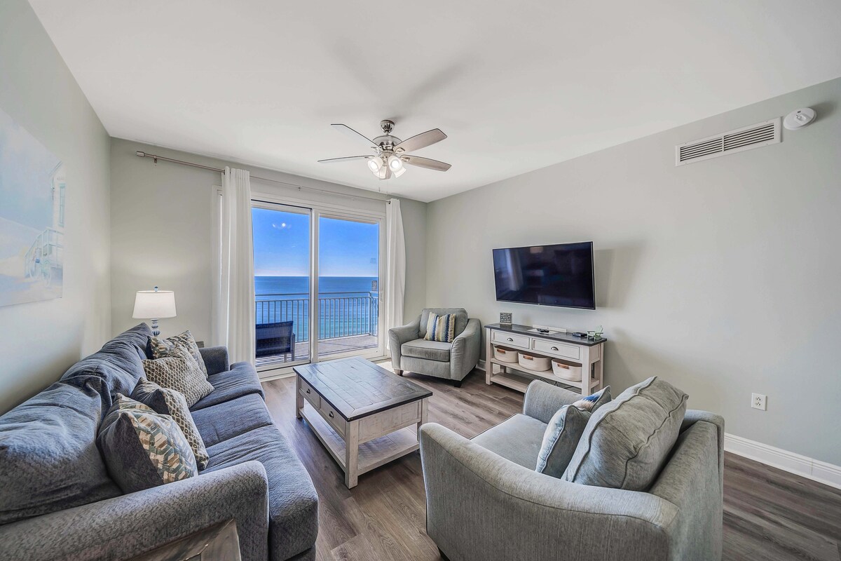 Relax on this units spacious balcony and watch the ocean waves crash underneath the sunset! The 3 bedroom unit sleeps 8 with a King bed in the master and 2nd bedroom, and Twin/Queen bunk bed in the third bedroom. Full kitchen with essentials, full sized refrigerator, washer and dryer. Fully vacation ready! Located just steps to the World's Most Beautiful Beaches. You will also only be a 5 minute walk to the pier, restaurants, shopping and activities of Pier Park! Read More Here!
