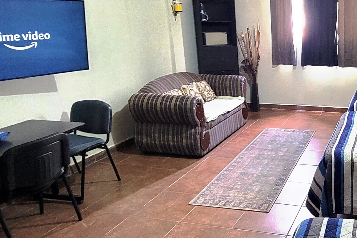 Moderno departamento con excelente ubicación, muy cómodo y adecuado para descansar y disfrutar. ¡Si vienes a la Huasteca estas en el centro de todos los parajes. Ubicados frente a un supermercado, cerca de farmacias, pizzeria, oxxo, etc. El área de camas esta en el mezzanine, cuenta con 2 comodas camas queen. El estacionamiento es en las inmediaciones, la zona es segura y colocamos lámparas exteriores para tener bien iluminado las afueras de los depas.