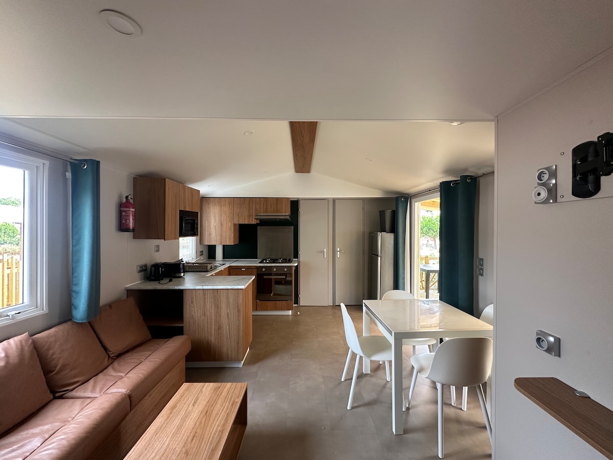 4つ星キャンプ場「レ・ヴィヴィエ」の静かなモバイルホーム。アルカション湾へのアクセスが便利です。 明るく、エアコン完備の宿泊施設。 大きな寝室2室(140x190のベッド、テレビ、ドレッシングルームを備えた親室と、90x190のベッド2台を備えた寝室)、🛋️ソファベッド、バスルーム、独立したトイレ。 シーズン中は屋根付きの閉鎖されたテラスで、ダイニングエリアとリビングエリアが整っています。 敷地内にはプランチャ、サンラウンジャー、小さなガーデンファニチャーがあります。 駐車スペース2台分