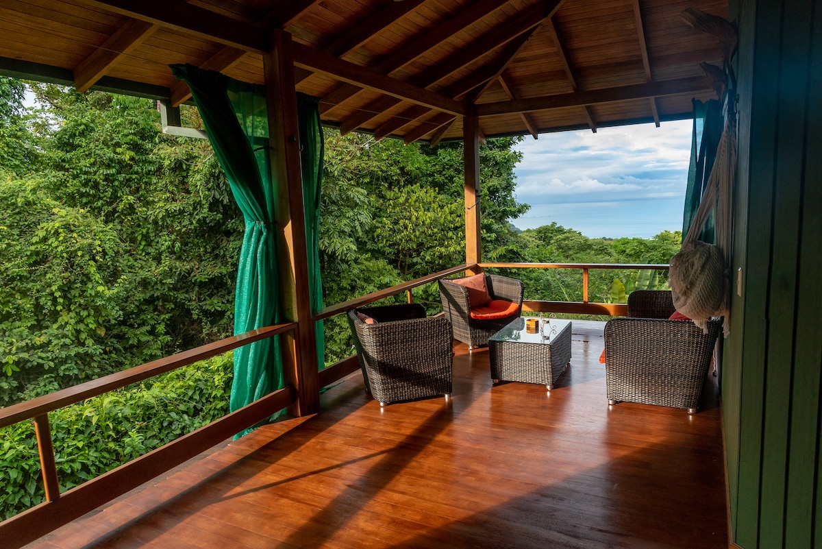 木々の上に建つロマンチックなバリ風の2階建ての家からは、イスラ・バジェーナ島、カニョ島、オサ半島の素晴らしい景色を眺めることができます。星空の下で露天風呂にゆっくりと浸かったり、ジャングルの音に包まれながら冷たい水に飛び込んでみませんか。プライベートでありながら町にも近いこの場所は、つながりや自然、そして魔法のようなひとときを求めるカップルにぴったりの隠れ家です。 特別な時間を求めるカップルのために設計されたこの家は、ゆっくりと自然と触れ合い、お互いに心を通わせることができる場所です。