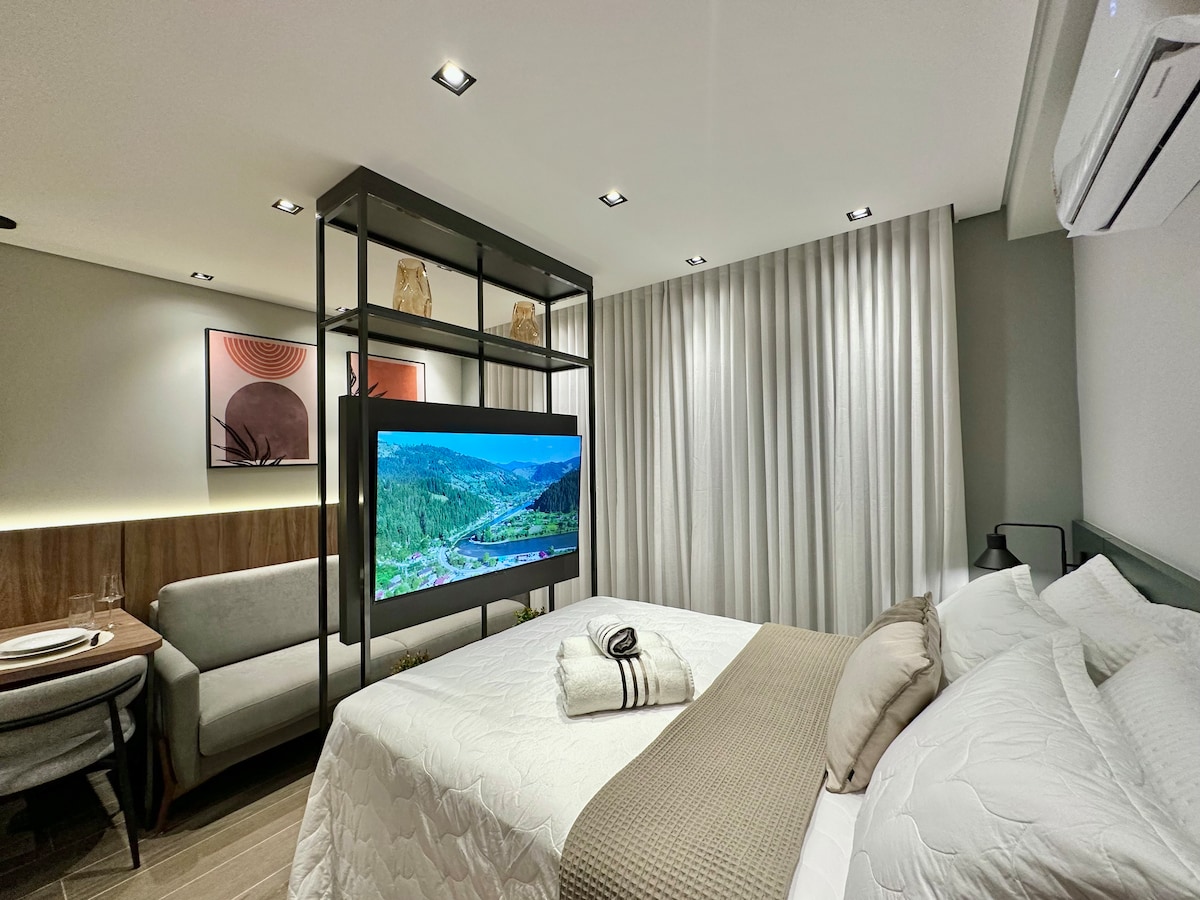 Temos aqui • Piscina Aquecida (terraço) 24h • Academia 24h • Cowork 24h • Lavanderia 24h • Mercadinho 24h • Bilhar 24h • Bicicletário c/ bikes disponibilizadas gratuitamente! • Internet rápida 500MB • Cama Queen • Churrasqueiras e forno (terraço) • Pet friendly • Estacionamento (pago) • Portaria 24h • Fácil cadastro, self check-in e acesso por código • Áreas para fumantes *toalhas e roupas de cama inclusas! *mande uma consulta!