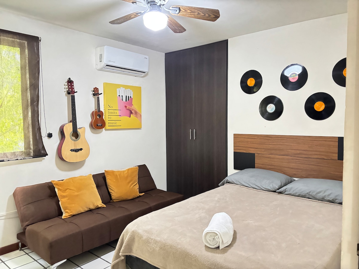 Moderno loft , cómodo con entrada independiente , cajita con clave. Tranquilo. Wifi. Tele con smart Tv. Agua caliente fría. Microondas. Cama Quin size lugar tranquilo con mesa y lugar para sentarse. Minisplit. Refrigerador. Microondas. Abanico toallas. Jabones de cuerpo shampoo y de manos.licuadora secadora de pelo plancha y tabla para planchar.cuenta con pequeña cocineta. Microondas. Tostador. Licuadora. Parrilla. Platos vasos y tarja para lavar trastes.frigo bar. Secadora de pelo.